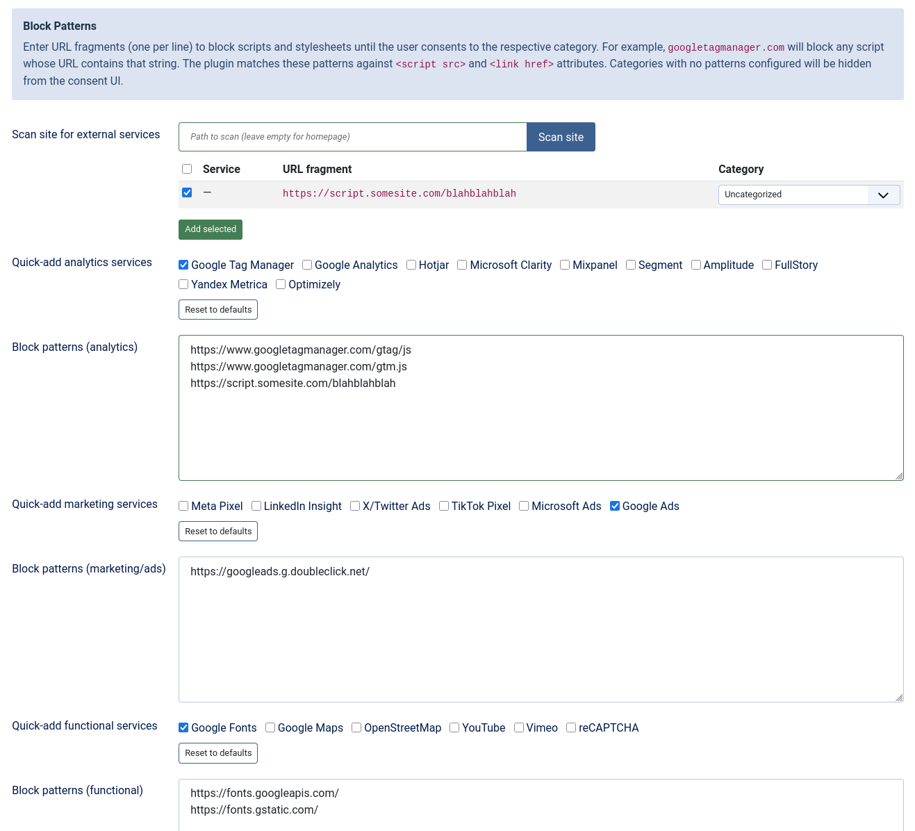 Here you can add your patterns that needs to be blocked until consent. You can add them manually, with a checkbox helpers or by an internal page scan directly implemented in the plugin.