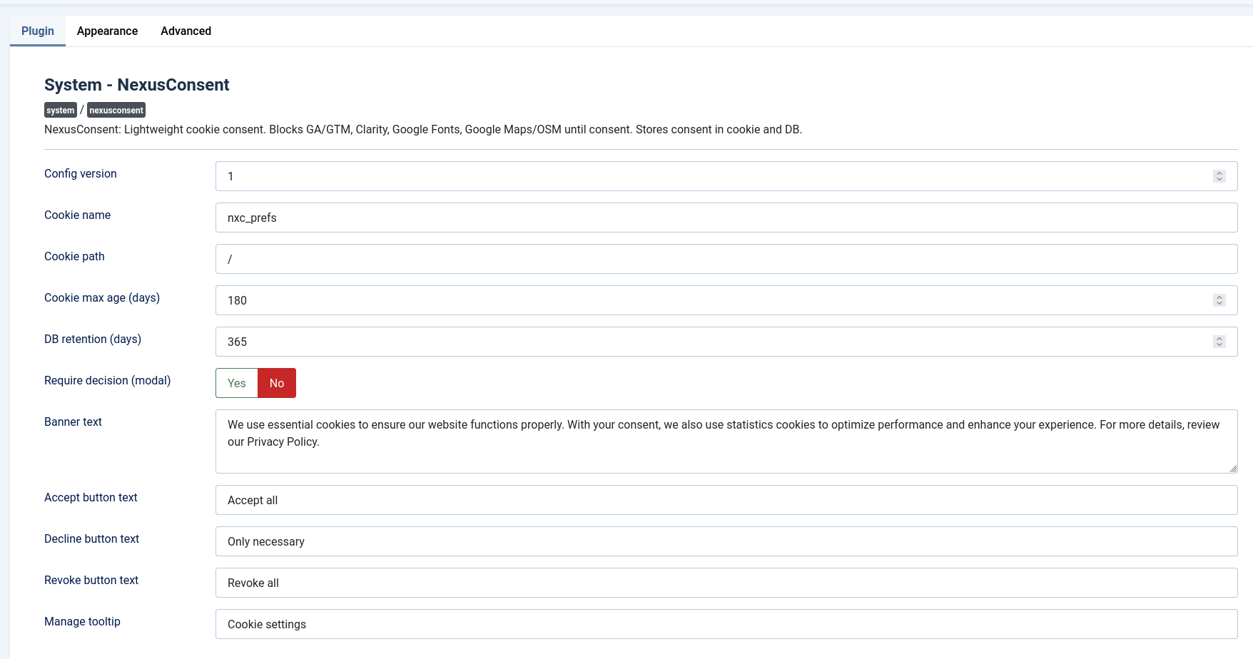 NexusConsent adds lightweight, GDPR-ready consent controls to Joomla. It blocks optional services until visitors opt in, keeps a minimal consent log, and provides an accessible consent UI.