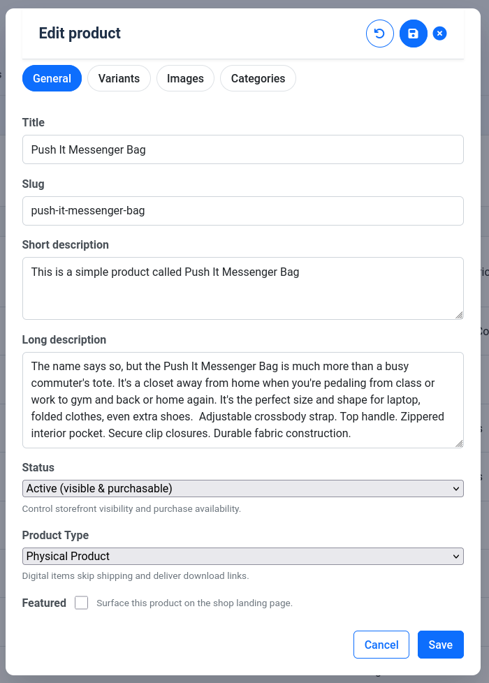 Product edit modal view. Convenient way to manage all of the product info in one single place