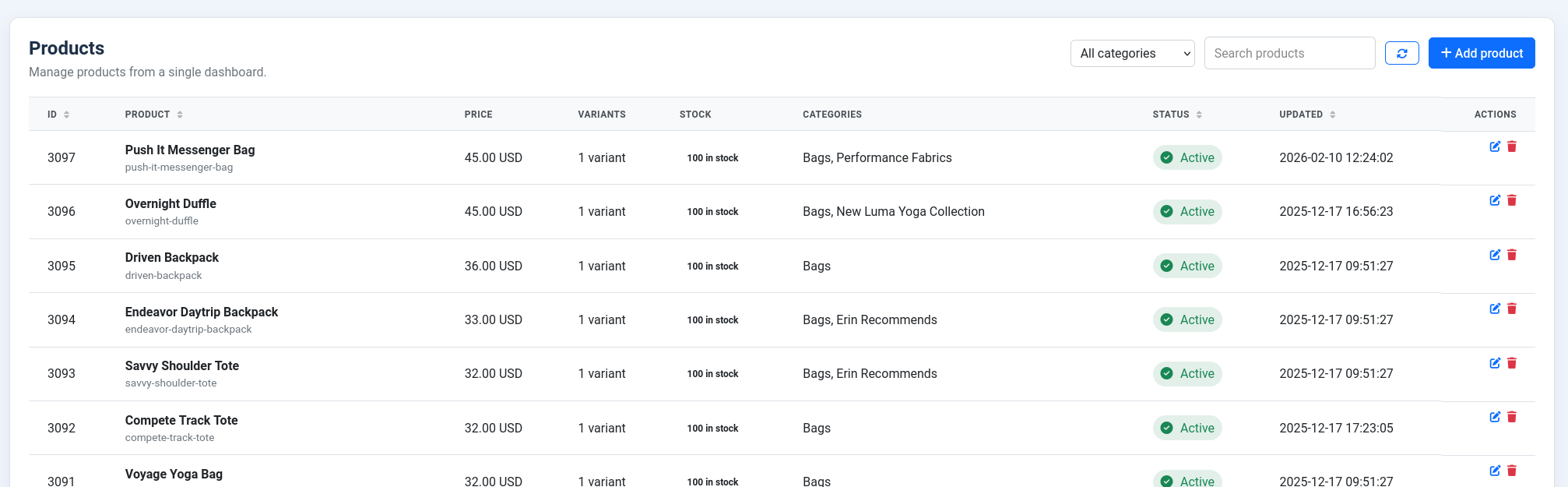 The product list view. Here you can check status, stock and other attributes. Also this is where you directly access product actions.